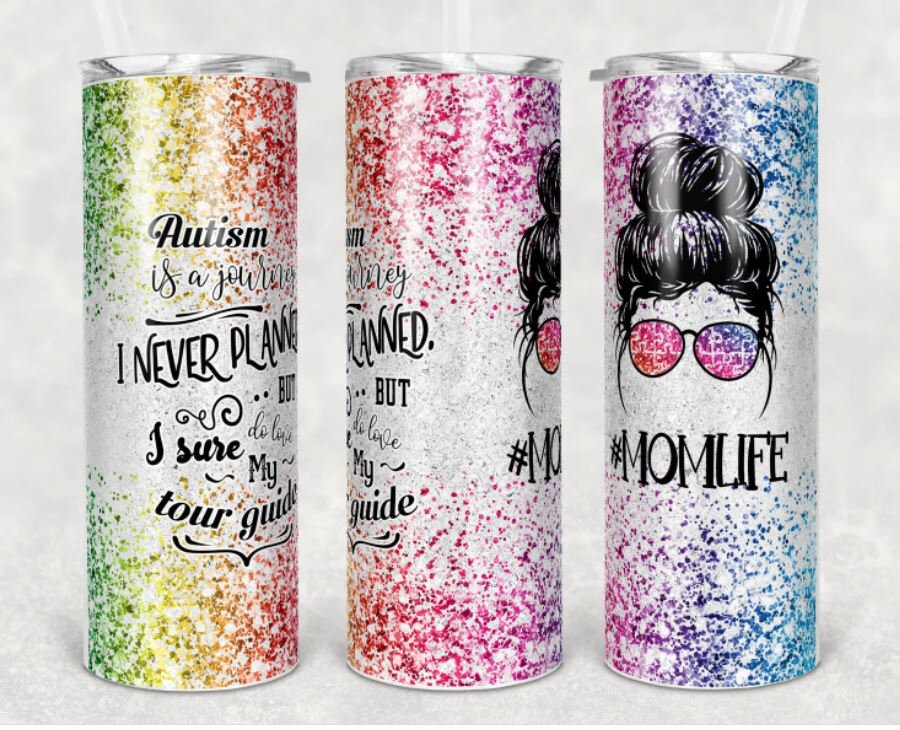 20 oz Skinny Tumbler, #momlife, Messy Bun, Autism, Stainless Steel Tumbler
