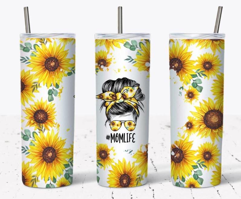 20 oz Skinny Tumbler, #momlife, Messy Bun, Sunflower, Stainless Steel Tumbler